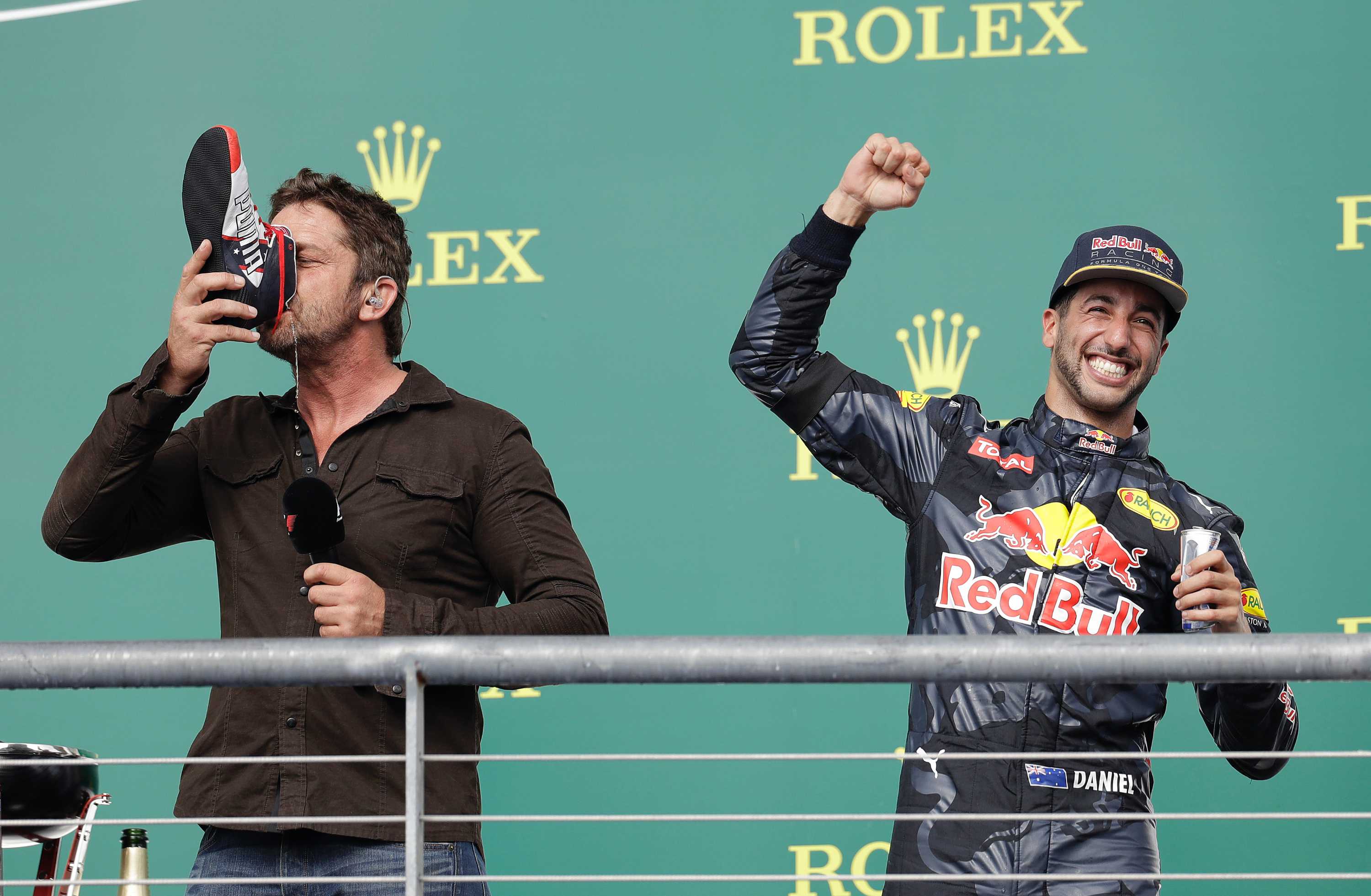 Daniel Ricciardo Gets Gerard Butler To Do A Shoey As Lewis Hamilton Wins United States F1 Gp Abc News
